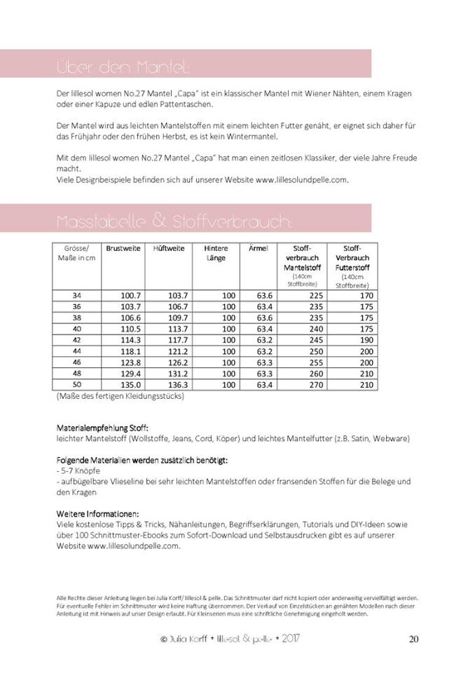 Der Mantel wird aus leichten Mantelstoffen mit einem leichten Futter genäht, er eignet sich daher für das Frühjahr oder den frühen Herbst, es ist kein Wintermantel. Mit dem lillesol women No.27 Mantel Capa hat man einen zeitlosen Klassiker, der viele Jahre Freude macht.