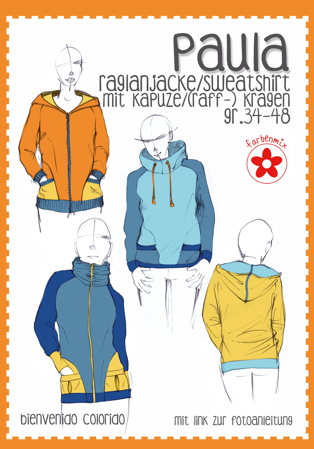 PAULA ist eine körpernah und leicht tailliert geschnittene Raglanjacke und kann aus Jersey, Sweat oder Nicky genäht werden. Durch die vielen stylischen Details bietet Paula jede Menge Spielraum für unterschiedliche Designs: