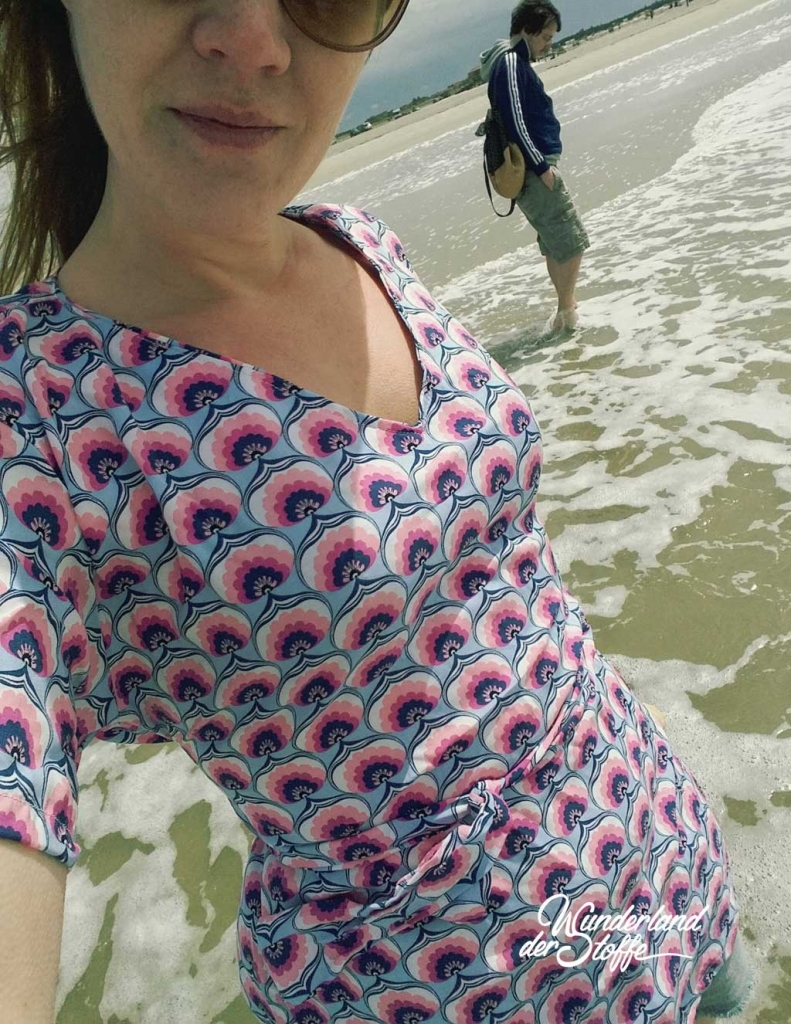 Es sind die Doppelgrößen XS/S, M/L und XL/XXL auf dem Bogen und die Tunika kann mit kurzen aber auch langen, etwas ausgestellten Ärmeln genäht werden. Die Länge lässt sich problemlos anpassen. Die Weite wird mit dem rückwärtigen Band reguliert. Damit sie perfekt sitzt, sollte die Tunika vor dem Aufnähen des Querstreifens einmal kurz überprobiert und dessen Höhe, sowie die genaue Position der Bindebänder nach Wunsch angepasst werden.