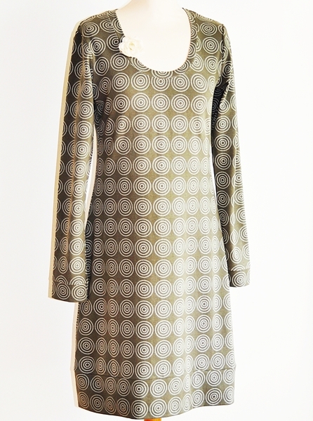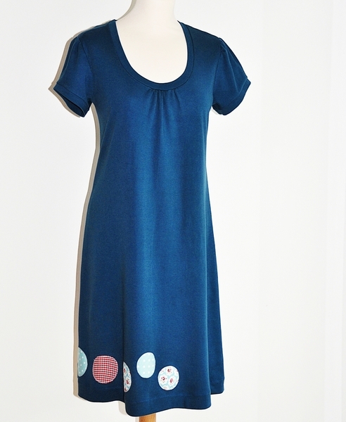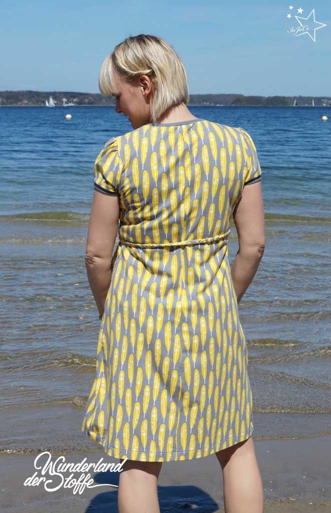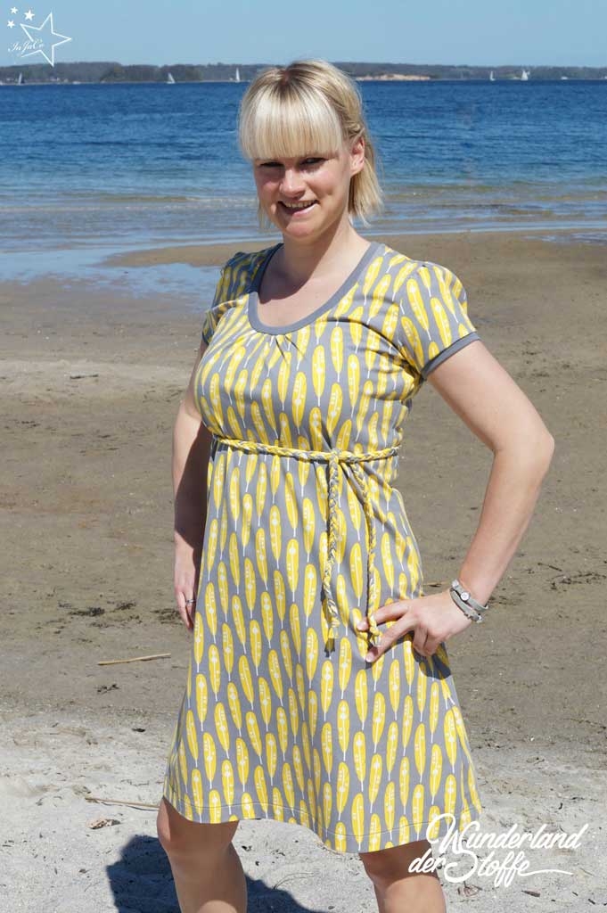 Das knielange, leicht ausgestellte Rundhalskleid kann wahlweise mit oder ohne Kräusel im Ausschnitt genäht werden. So fällt es entweder körpernah oder aber etwas weiter aus. Zur Wahl stehen drei unterschiedliche Ärmellängen, ein kleiner Puffärmel und zwei mögliche Ausschnitttiefen. So wird das Kleid sommer- und wintertauglich. Eine Kängurutasche gibt ihm eine sportliche Note und die Saumabtrennung macht einen Farb- oder Mustermix möglich.