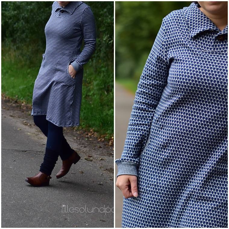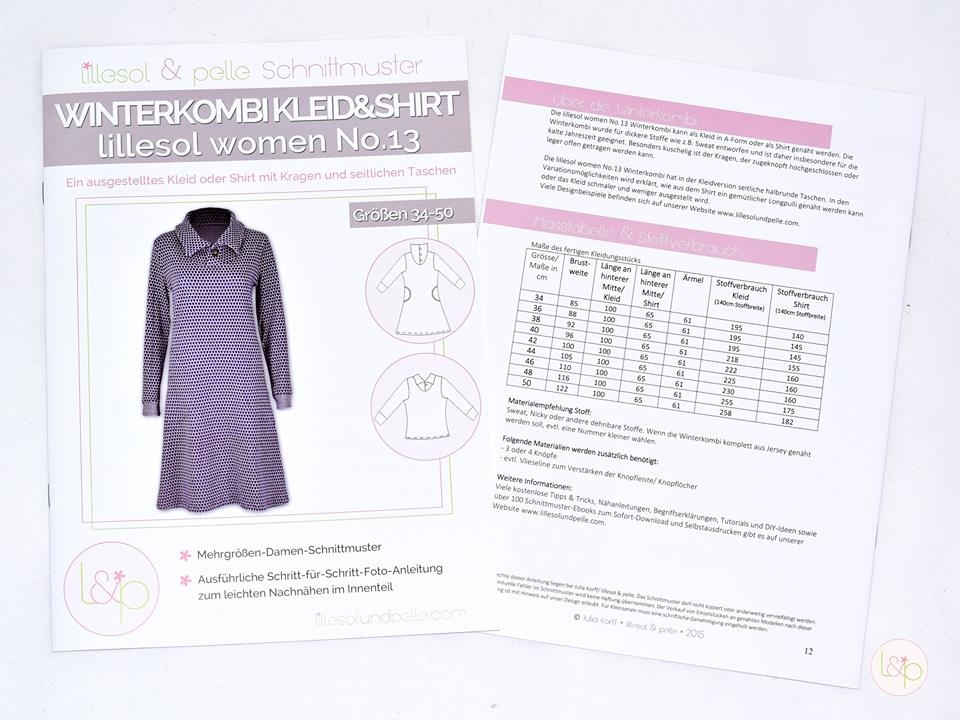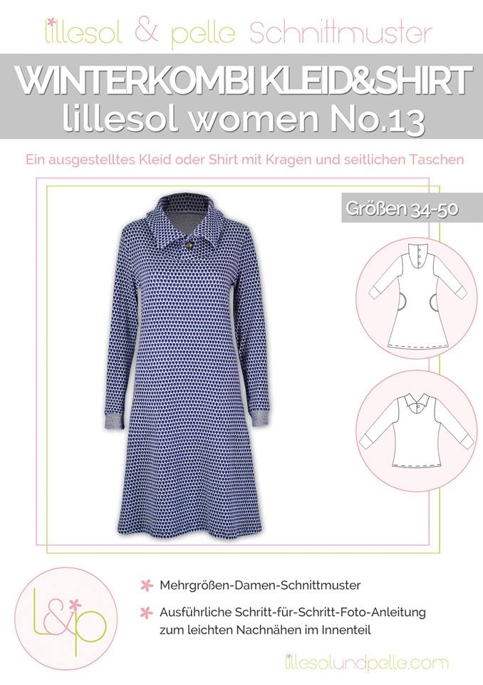 Die lillesol women No.13 Winterkombi kann als Kleid in A-Form oder als Shirt genäht werden. Die Winterkombi wurde für dickere Stoffe wie z.B. Sweat entworfen und ist daher insbesondere für die kalte Jahreszeit geeignet. Besonders kuschelig ist der Kragen, der zugeknöpft hochgeschlossen oder leger offen getragen werden kann. Die lillesol women No.13 Winterkombi hat in der Kleidversion seitliche halbrunde Taschen. In den Variationsmöglichkeiten wird erklärt, wie aus dem Shirt ein gemütlicher Longpulli genäht werden kann oder das Kleid schmaler und weniger ausgestellt wird.