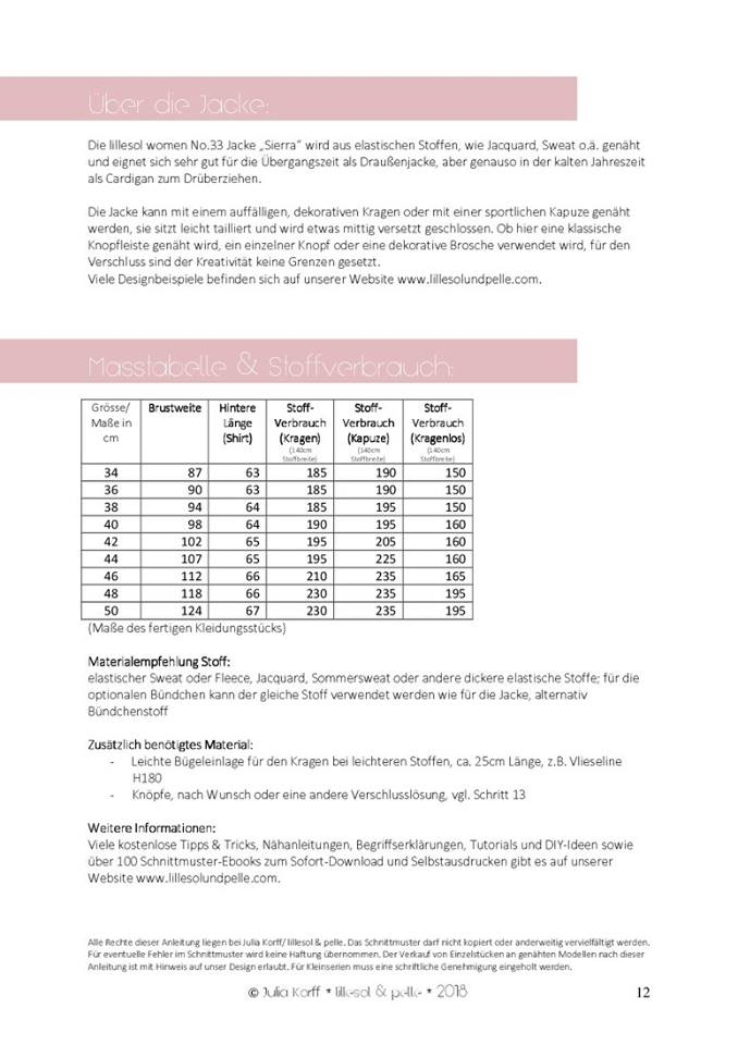 Das Papier-Schnittmuster enthält eine farbig gedruckte DinA4-Broschüre mit Schritt-für-Schritt-Fotoanleitung, Angaben zum Stoffverbrauch & Nähhinweisen sowie alle Schnittmuster für die Größen 34 - 50 auf einem farbigen DinA0-Bogen. Als Extra liegt dem Schnittmuster eine Maxi-Karteikarte für individuelle Nähnotizen bei.