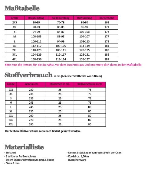 Die Softshelljacke ist ein toller Schnitt für Näher und Näherinnen, die schon ein bisschen Erfahrung im Nähen haben. Die Rückseite ist länger geschnitten als das Vorderteil – das ist nicht nur schick, sondern hält auch das Gesäß angenehm warm. Im Schnitt sind ausführliche Beschreibungen zu den Eingriffstaschen, der Verarbeitung von Belegen und dem Einnähen von Reißverschlüssen enthalten.