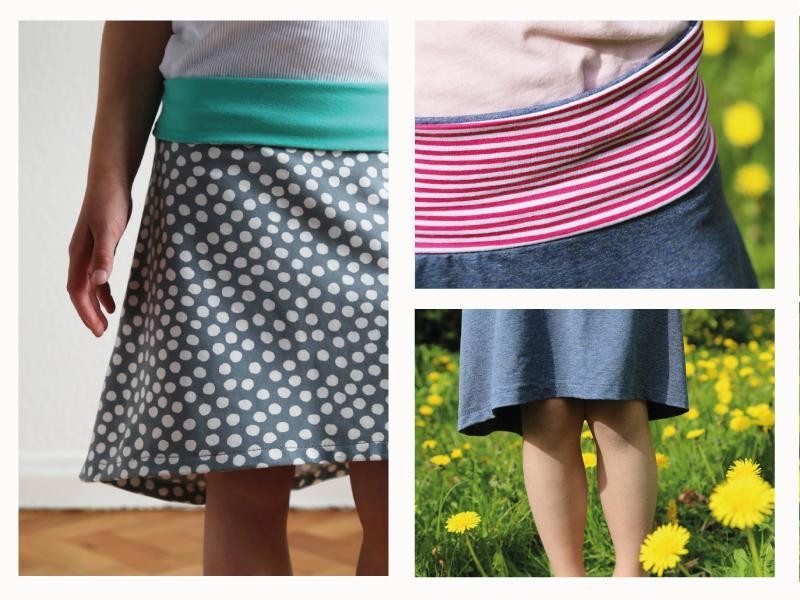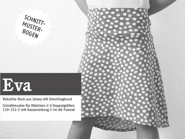 Eva ist der perfekte Rock für heiße Sommertage. Er ist superschnell genäht und sitzt richtig bequem! Sein breites Bündchen läd ein zu Spielereien. Du kannst es einfarbig oder aus zwei Stoffen nähen und durch das Umklappen des Bündchens wird der Rock in der Länge variabel. Der besondere Hingucker an Eva ist ohne Zweifel die Saumkante, die vorne kurz über dem Knie endet, nach hinten aber länger wird und dort die Kniekehlen umspielt - oder Du trägst ihn kürzer - ganz wie Du magst...