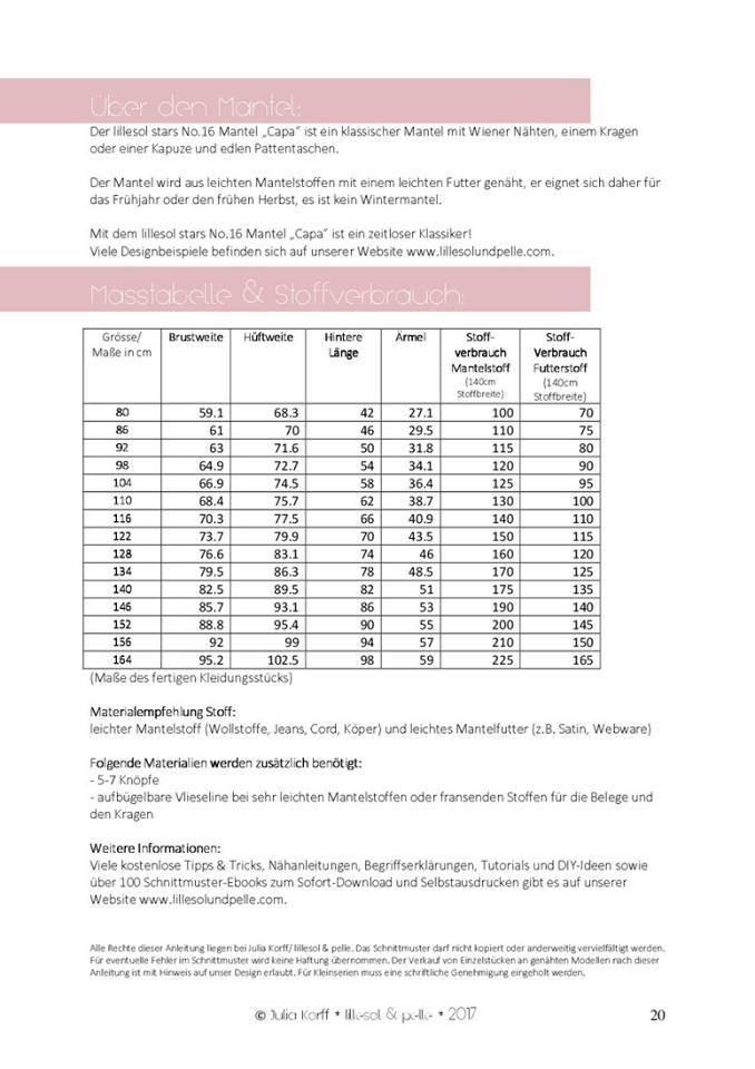 Mit dem lillesol stars No.16 Mantel Capa ist ein zeitloser Klassiker! Das Papier-Schnittmuster enthält eine farbig gedruckte DinA4-Broschüre mit Schritt-für-Schritt-Fotoanleitung, Angaben zum Stoffverbrauch & Nähhinweisen sowie alle Schnittmuster für die Größen 80 - 164 auf einem farbigen DinA0-Bogen. Als Extra liegt dem Schnittmuster eine Maxi-Karteikarte für individuelle Nähnotizen bei.
