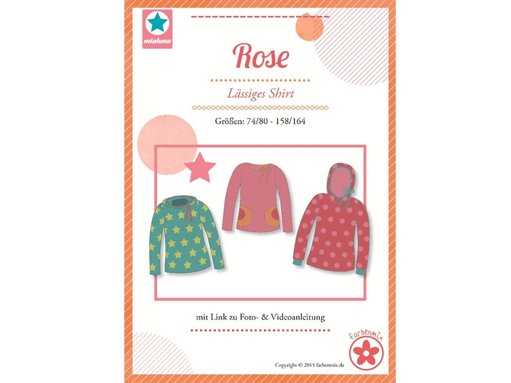 "Rose" ist ein Shirt mit einigen Varianten. Es fällt in Weite und Länge normal aus und kann auch für Jungs genäht werden, wenn die seitlichen Taillierung begradigt werden. Der Schnitt kann mit oder ohne Kapuze, mit oder ohne Taschen genäht werden.