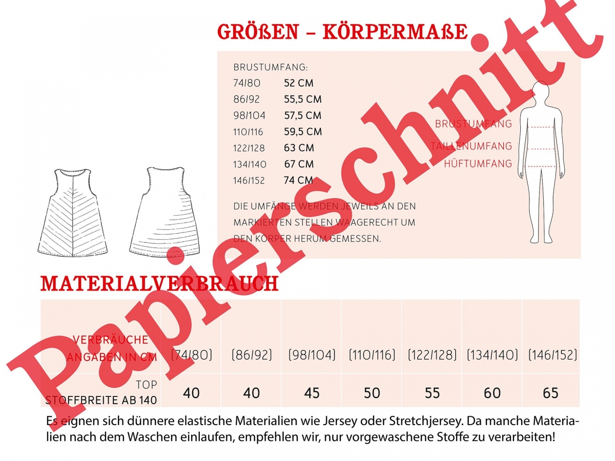 Materialempfehlung: dünnere elastische Materialien wie Jersey oder StretchjerseyGrößen: 7 Doppelgrößen 74/80 bis 146/152