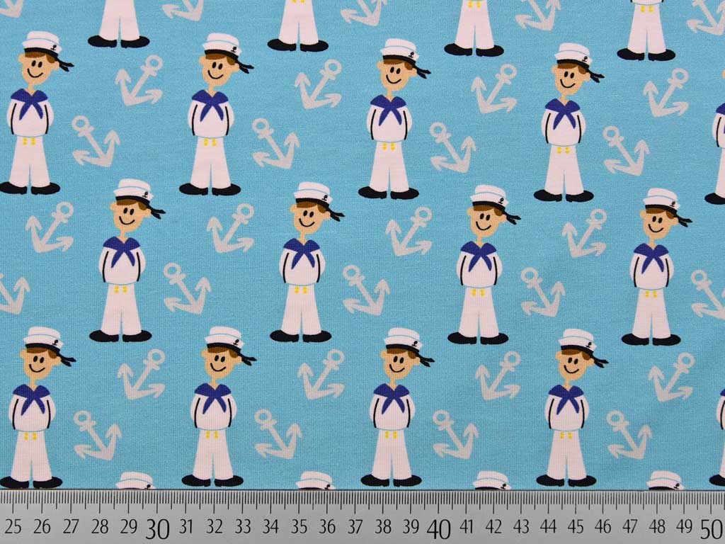 Ein hellblauer Baumwolljersey aus dem Hause Hilco in mit weißen Matrosen und kleinen, grauen Ankern.