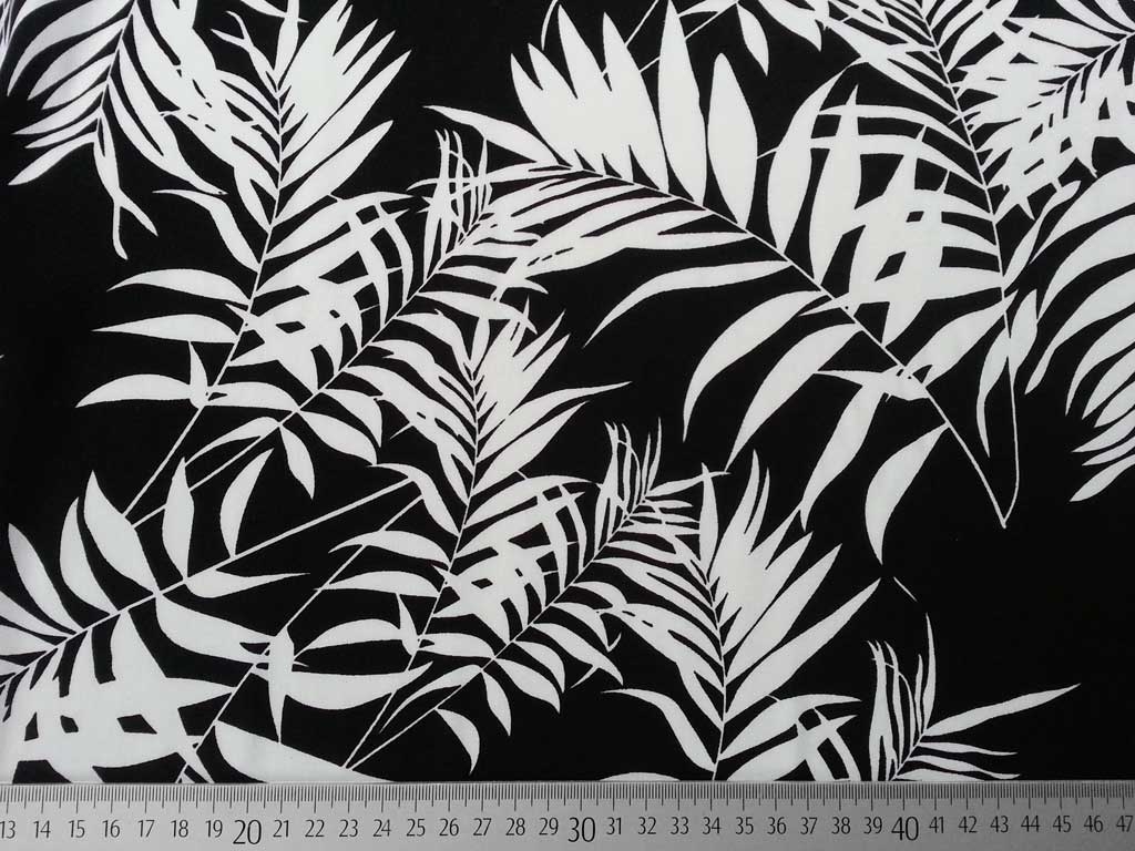 Ein luftig leichter und locker fallender Viskose Stoff in schwarz mit weißen Blättern. Weich im Griff.
