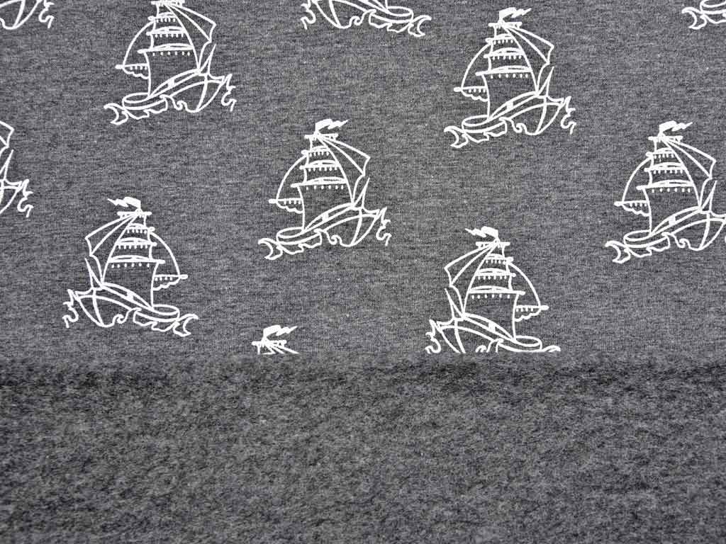 Ein weicher Sweat in anthrazit melange mit weißen Segelbooten. Die Rückseite ist angeraut und somit kuschelig weich.