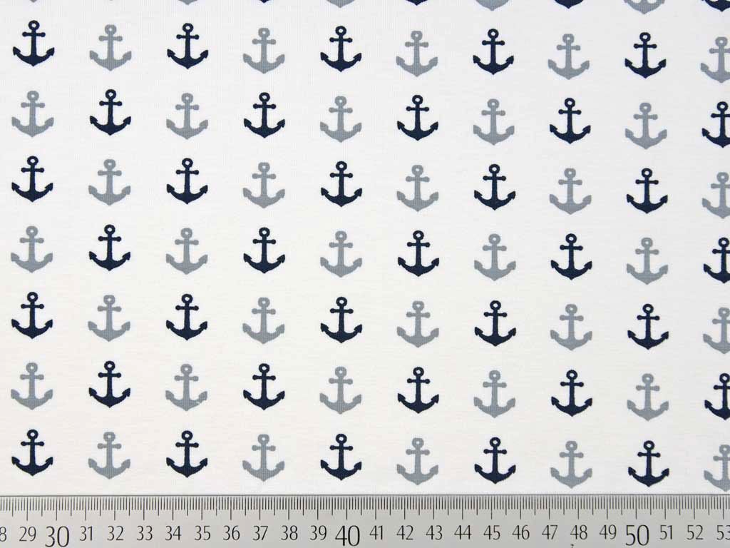 Ein weicher Baumwolljersey in weiß mit kleinen dunkelblauen und grauen Ankern.