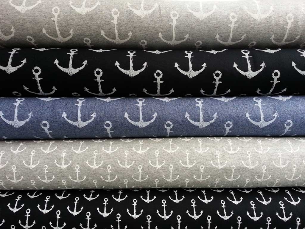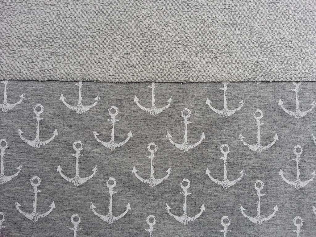 Ein super cooler Sommersweat (unangeraute Rückseite) in angesagtem grau melange mit maritimen Ankern in weiss. Der Anker ist 3,5 cm hoch.