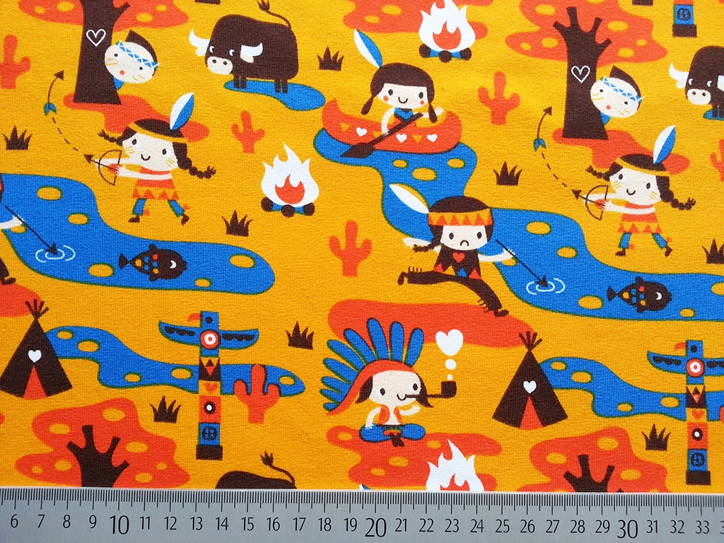 Ein weicher Bio-Jersey von Lillestoff in schönem Sonnengelb mit Indianern, Zelten, Federn, etc.