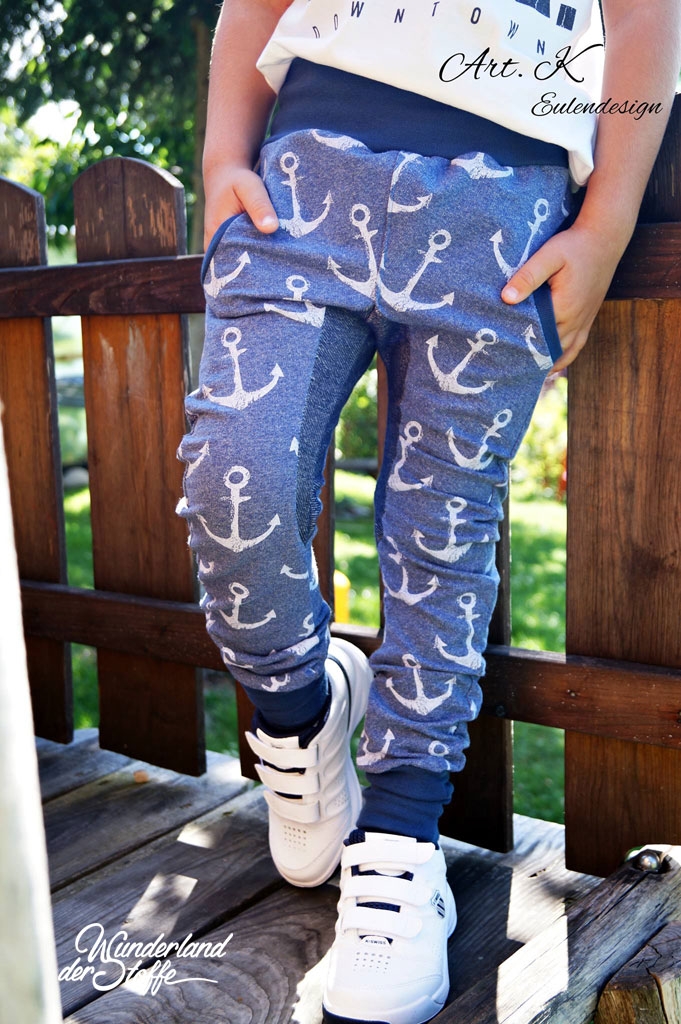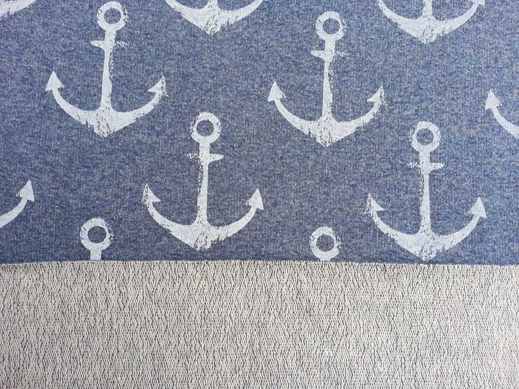 Ein super cooler Sommersweat (unangeraute Rückseite) in angesagtem jeansblau melange mit maritimen Ankern in weiss. Der Anker ist 6,7 cm hoch.