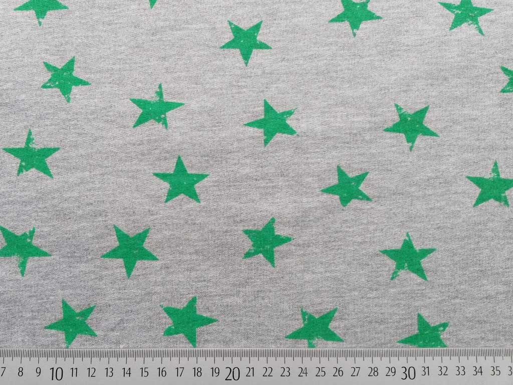 Ein super cooler Sweat in grau melange mit 3,5 cm grossen Sternen in grün. Kuschelig weich aufgrund der angerauten Rückseite!