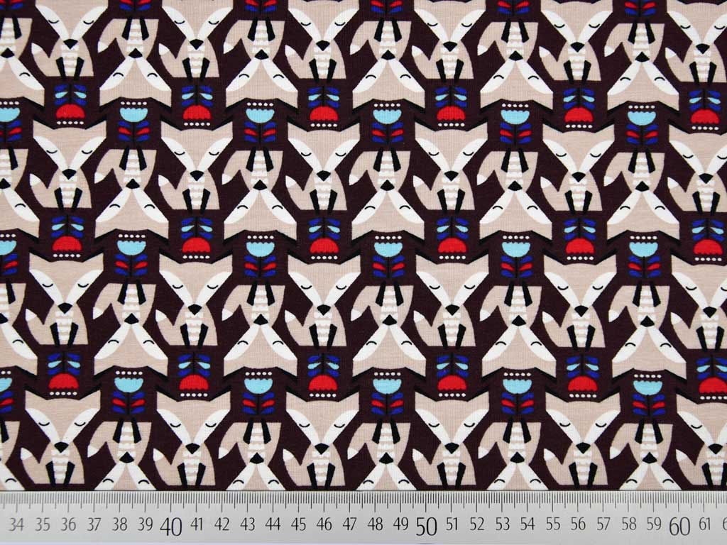 Ein weicher Baumwolljesey mit beige-braunen Füchsen und Blumen.