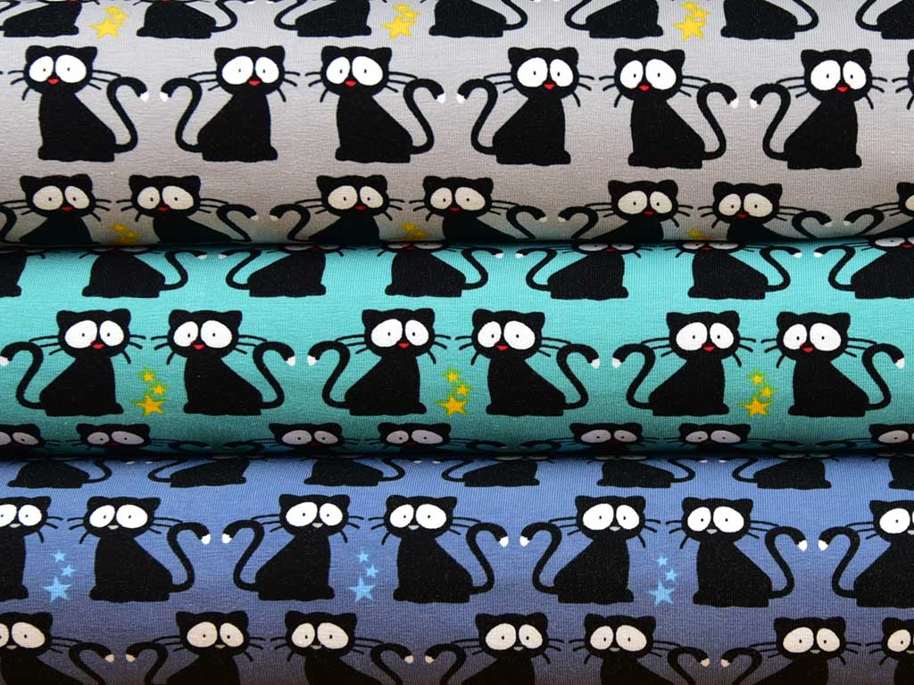 Ein weicher Baumwolljersey in mint mit schwarzen Katzen und kleinen Sternchen.