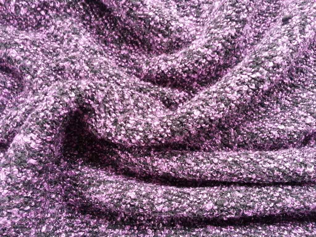 Ein mitteldichter hochwertiger Boucle Strick in lila-schwarz meliert. Weich im Griff. Der Stoff ist weich im Griff und kratzt nicht trotz des Wollanteils.