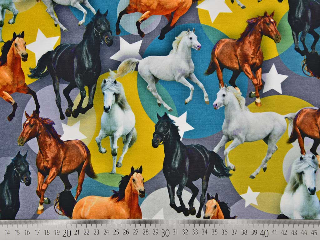 Ein weicher Baumwolljersey als Digitaldruck mit verschiedenen Pferden.
