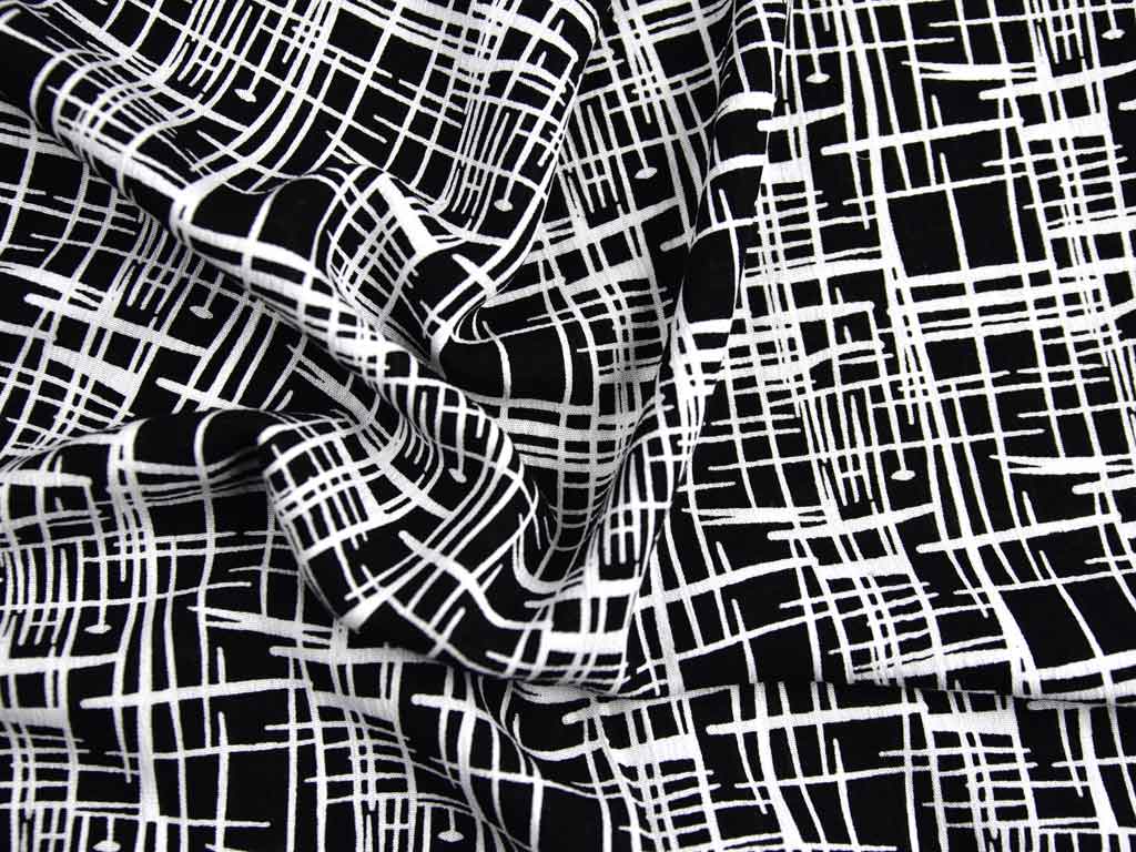 Ein weicher und fließender Viskose Stoff in schwarz mit weißem gestrichelten Muster.