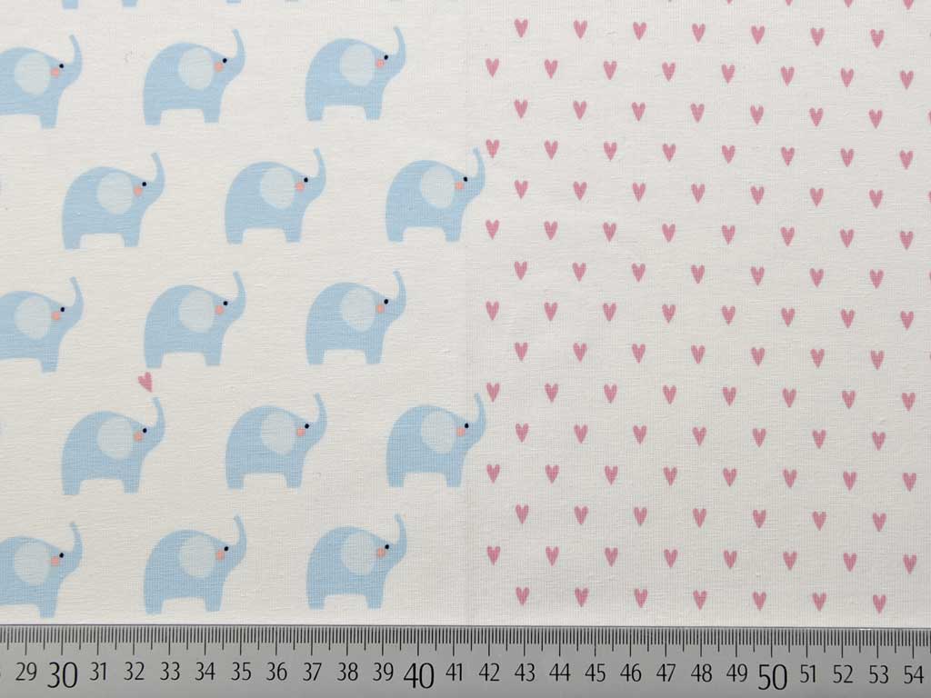 Ein weicher Baumwolljersey aus hochwertiger Kompakt Baumwolle in cremeweiß mit hellblauen Elefanten und dem passenden Kombistoff mit rosa Herzen. Auf einer Breite von 150 cm besteht die eine Hälfte (75cm) aus Elefanten, die andere Hälfte (75cm) aus Herzchenstoff.