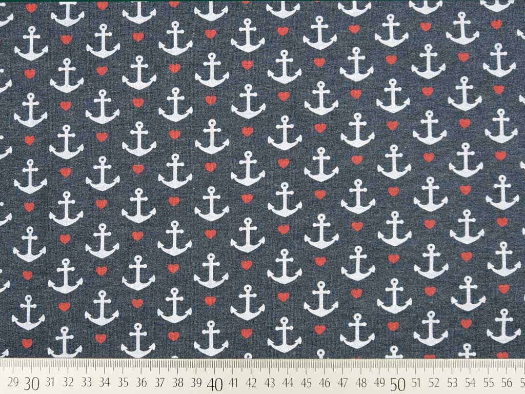 Ein weicher Jersey in trendigem dunkelblau melange mit kleinen weißen Ankern und roten Herzchen.