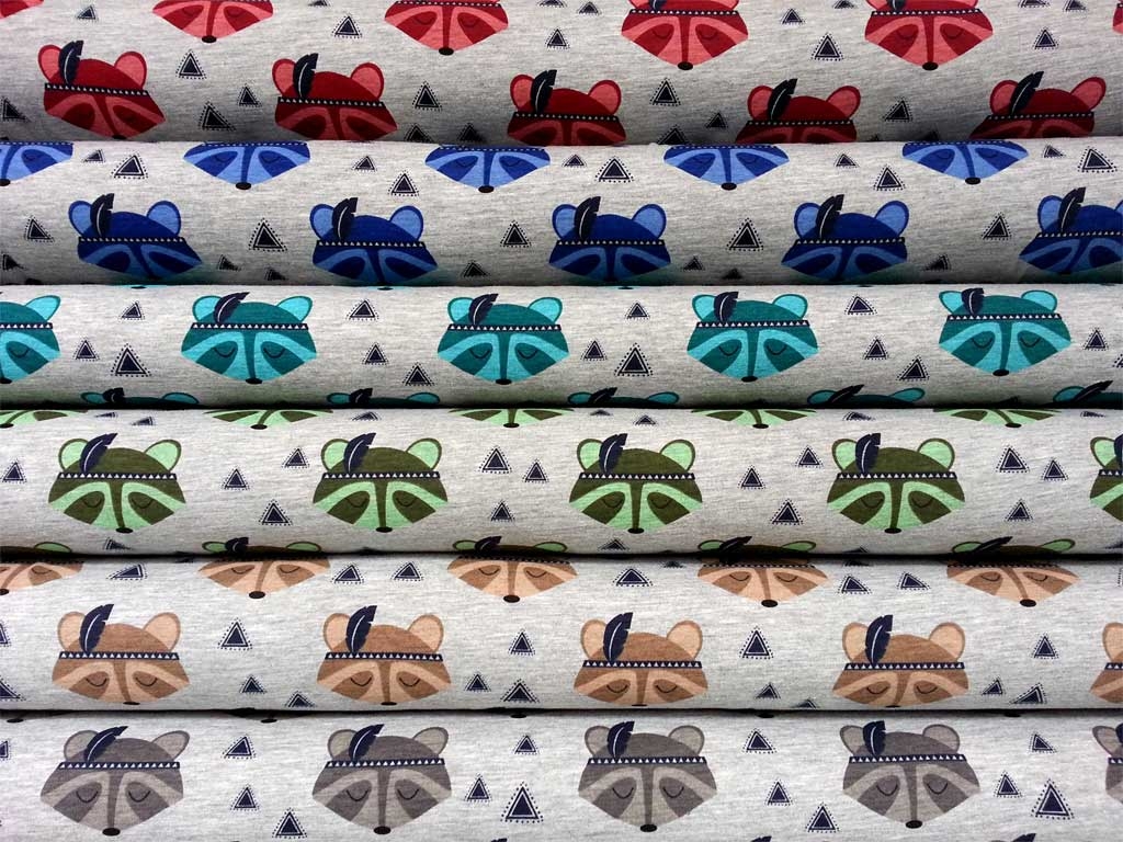 Ein weicher Baumwolljersey in graumelange mit dunkelroten Waschbärgesichtern mit dunkelblauer Feder und kleinen Dreiecken.