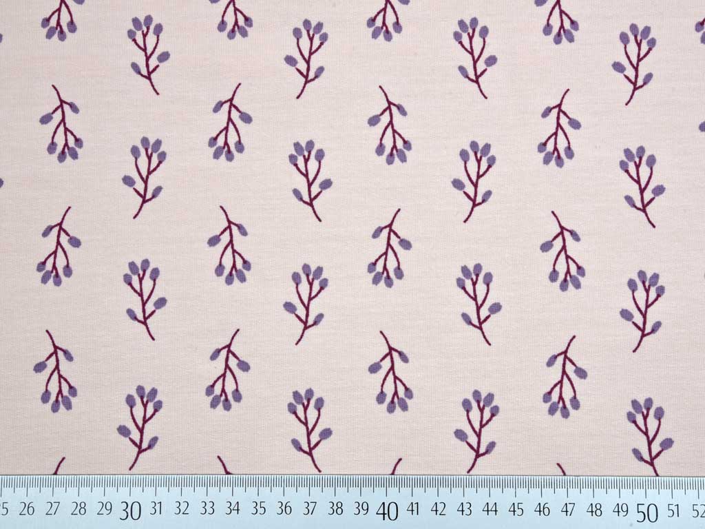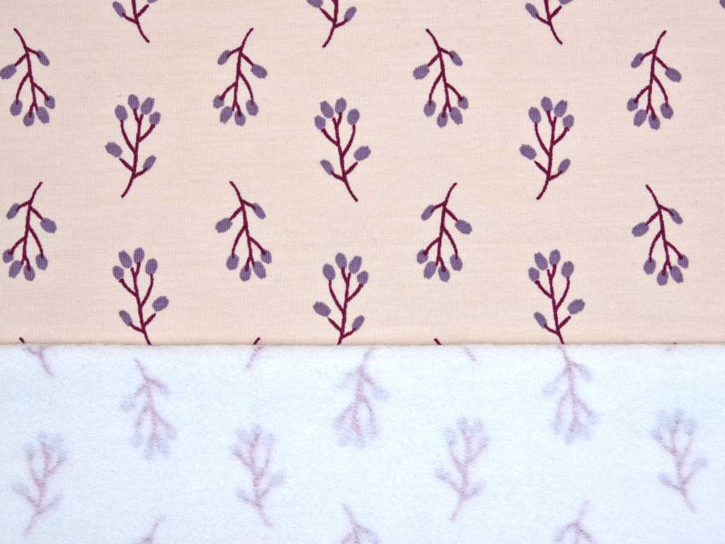 Ein weicher Sweat in nude (beige mit leichtem rosa Stich) mit bordeaux-farbenen Zweigen und Knospen in lavendel. Die Rückseite ist angeraut und somit kuschelig weich.