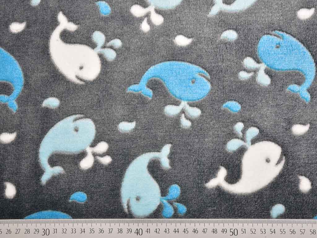 Ein kuschelig weicher Wellness Fleece Jacquard in dunkelgrau mit hellblauen und türkisen Walen. Die Rückseite ist flauschig weich.