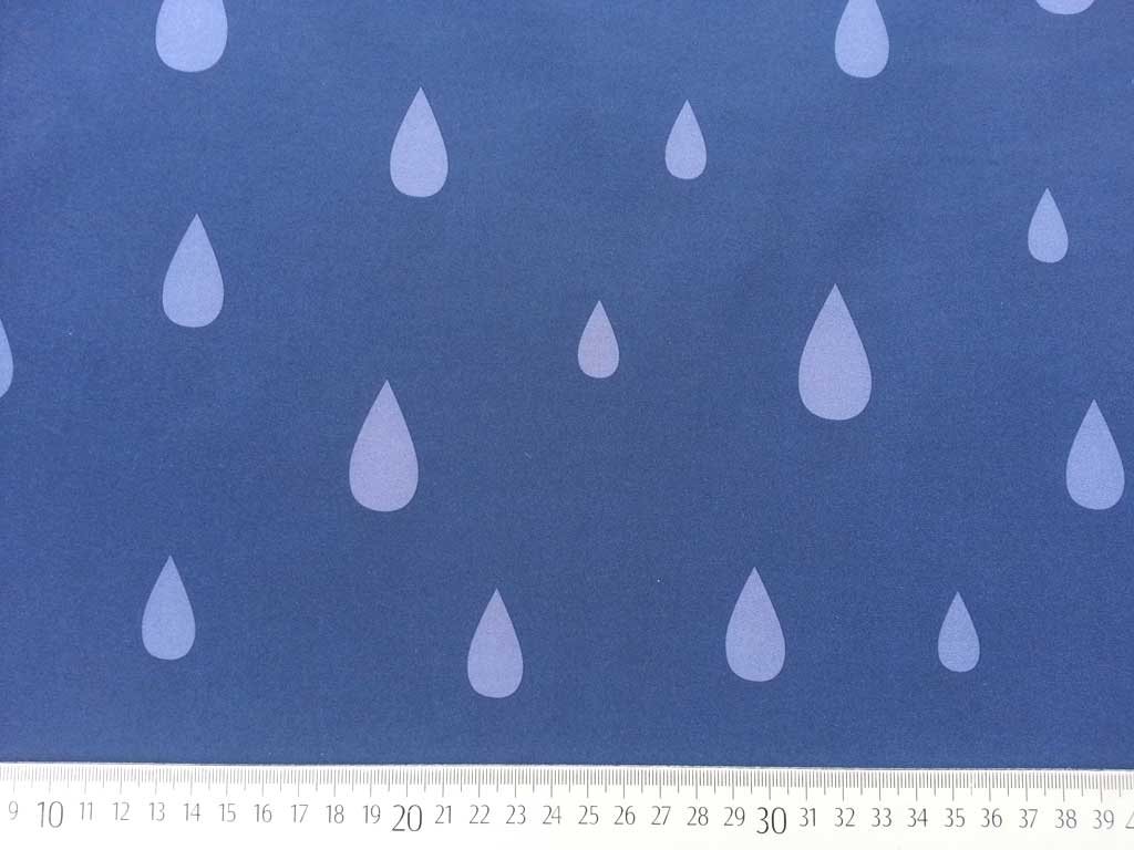 Ein wind- und wasserabweisender Softshell Stoff in dunkelblau mit jeansblauen Regentropfen. Die Rückseite besteht aus angenehm weichem Fleece in jeansblau. Durch den Elasthan Anteil dehnt sich der Stoff leicht und bietet somit hohen Tragecomfort.