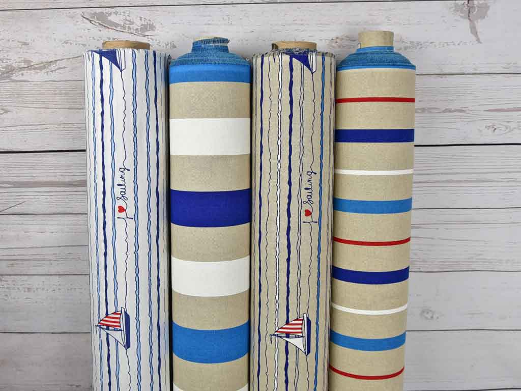 Ein schöner Dekostoff in Leinen-Optik (Farbe natur) mit Streifen in unterschiedlichen Breiten in weiß, rot, dunkelblau und blau.