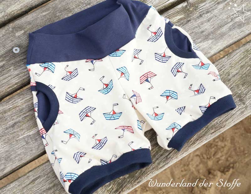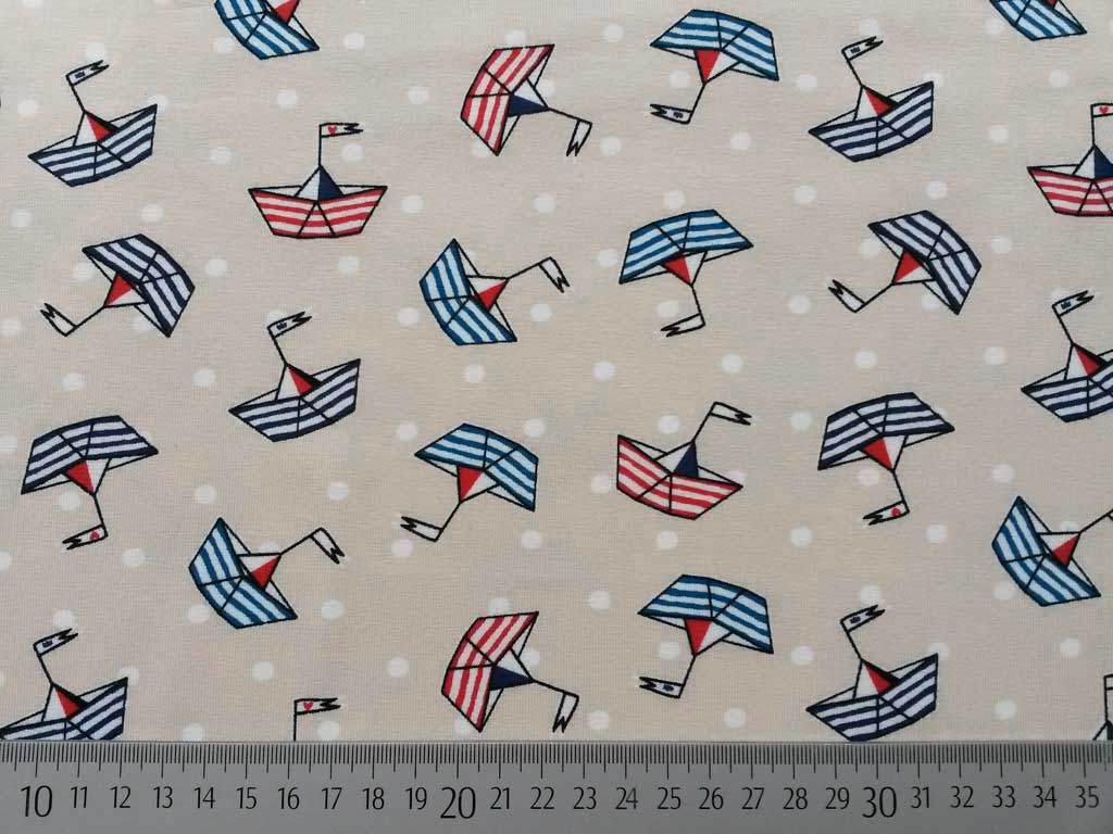 Ein weicher Jersey in hellbeige mit weißen Punkten und dunkelblau, mittelblau und rotgestreiften Papierschiffchen.