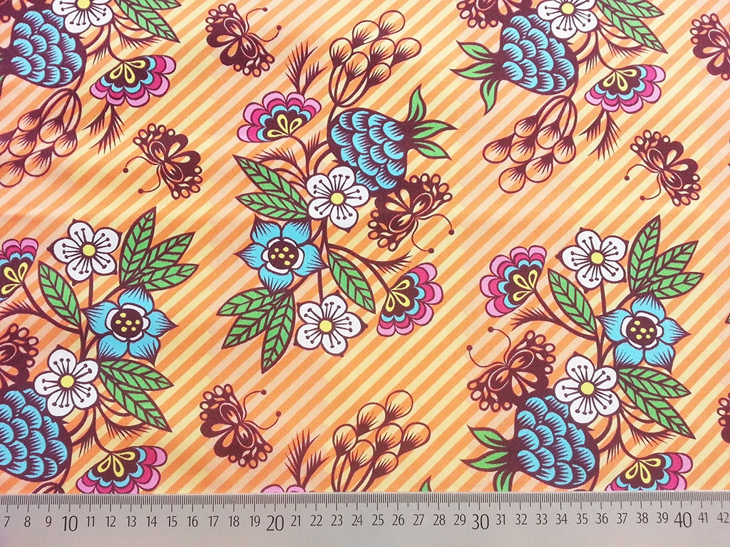 Ein wunderschöner Baumwollstoff mit dem Namen "Aloha" aus der Serie Kamehameha von Hamburger Liebe in orange-gestreift mit opulentem Blumenmuster, produziert von Hilco in bekannt hochwertiger Qualität.