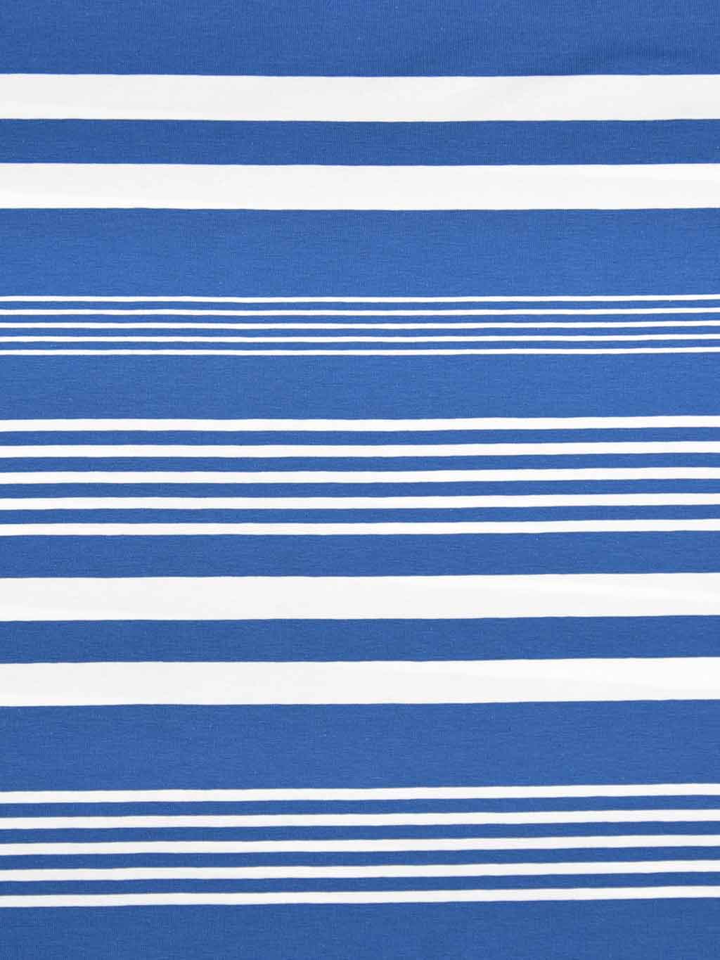 Ein weicher, himmelblauer Jersey mit unterschiedlich breiten, weißen Streifen. Der schmalste Streifen ist 2mm breit, der Breiteste 19mm.