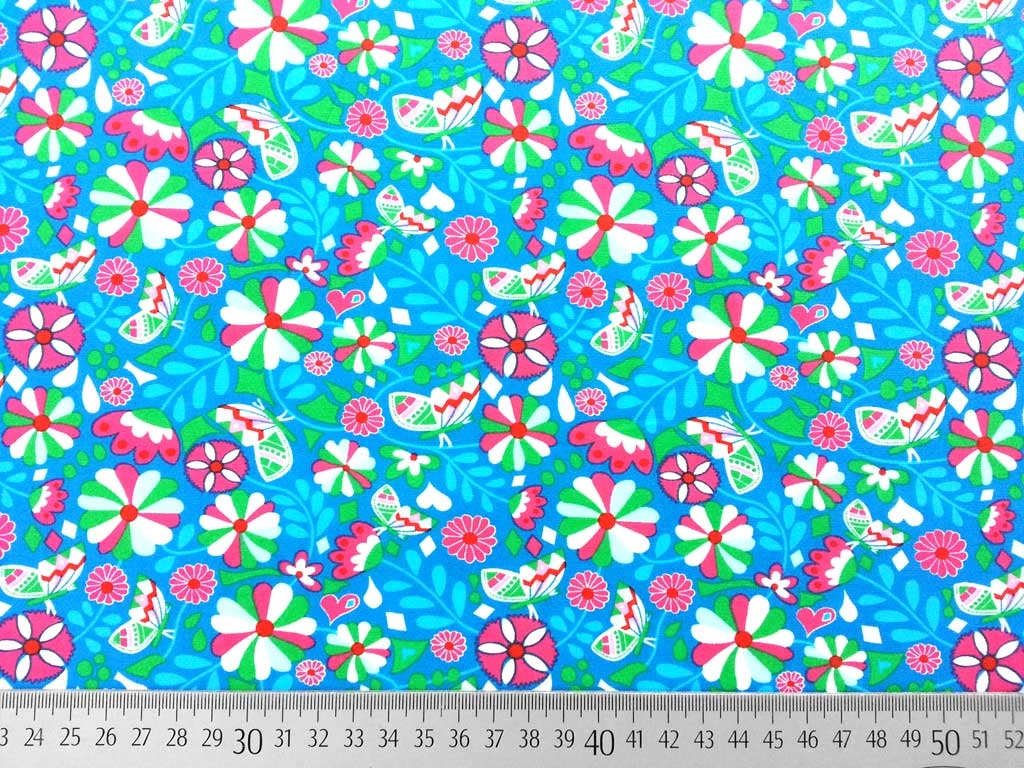 Ein wunderschöner Baumwollpopelin in türkis von Jolijou aus der Serie Betty Bloom mit Blumen und Schmetterlingen.