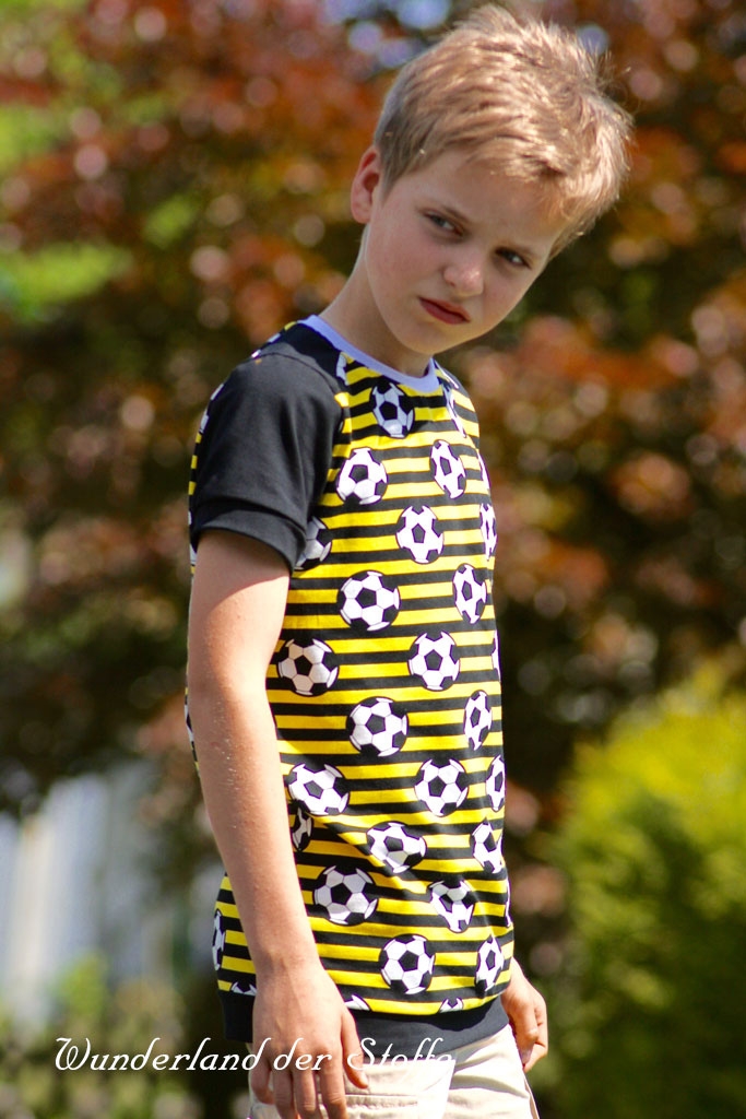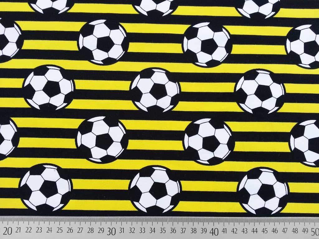 Ein toller Jersey mit schwarz-weißen Fußbällen auf gelb-schwarzen Streifen.