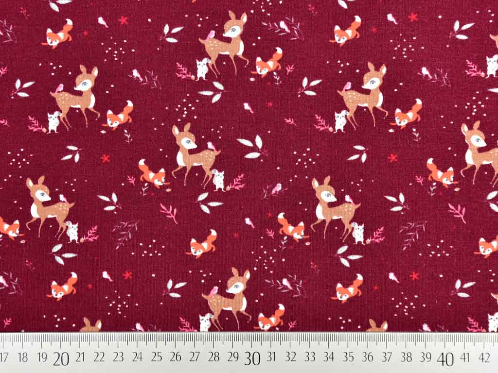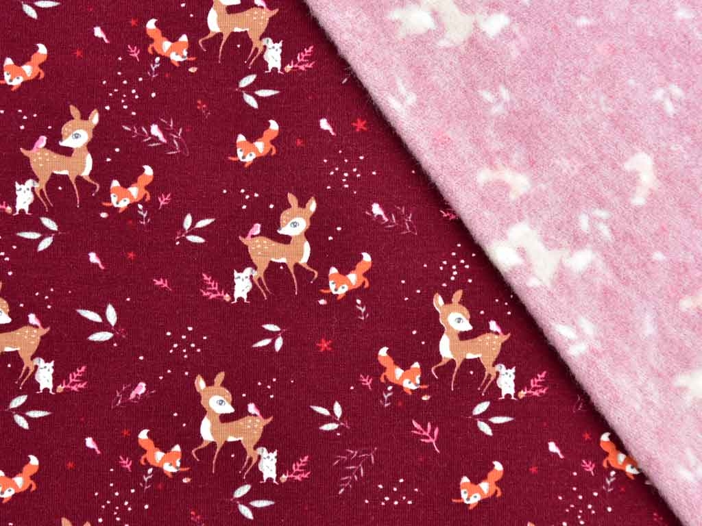 Ein weicher, Sweatstoff in Bordeaux mit süßen Rehkitzen, Füchsen und Eichörnchen, die von fallenden Herbstblättern umgeben sind. Die Rückseite ist angeraut und ist somit kuschelig weich.