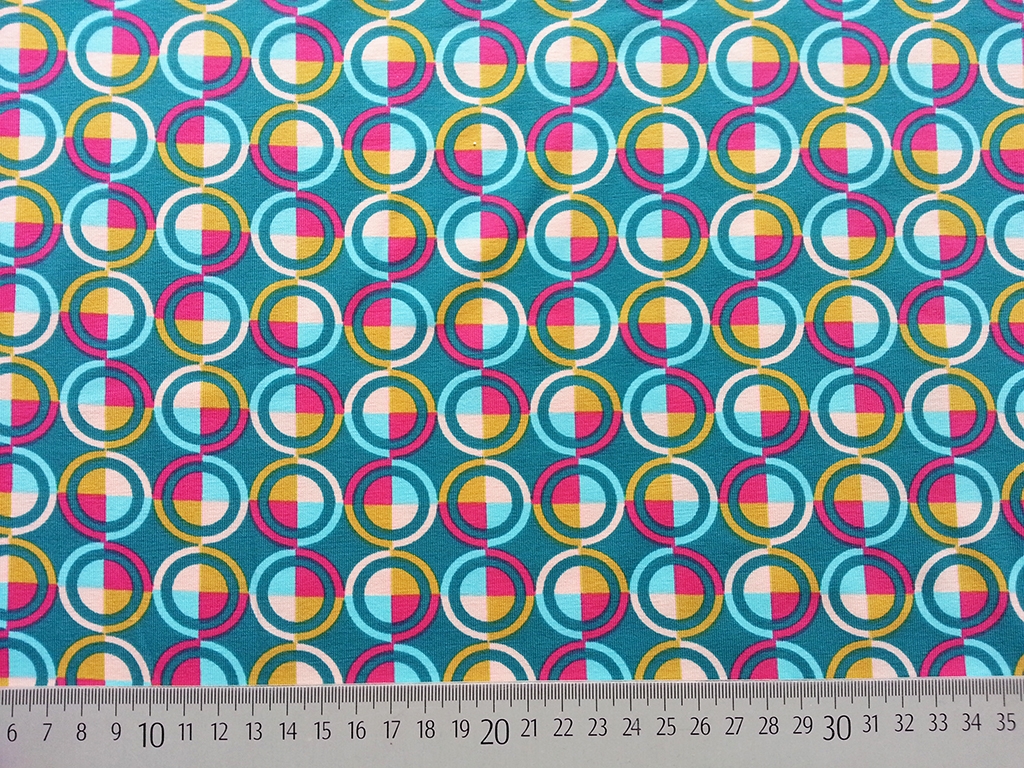 Ein wunderschöner Jersey im Retrolook in petrol mit geviertelten Kreisen in helltürkis, pink, senf und rosa.