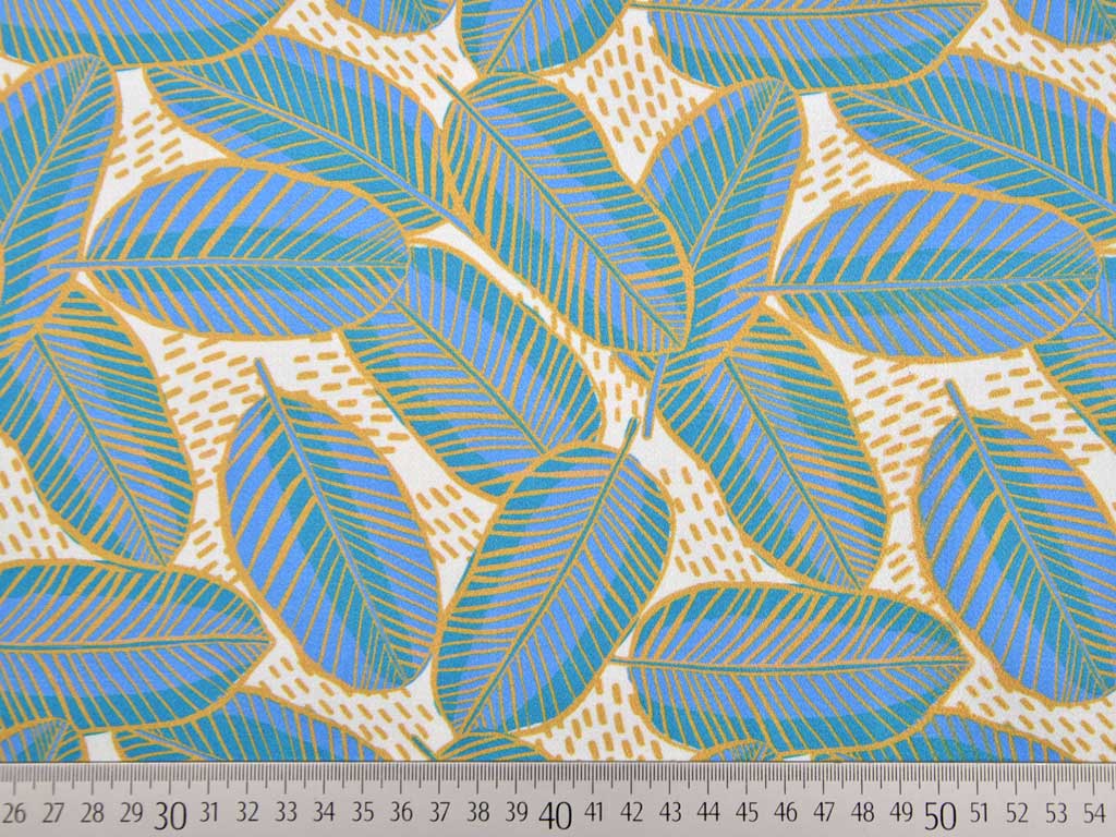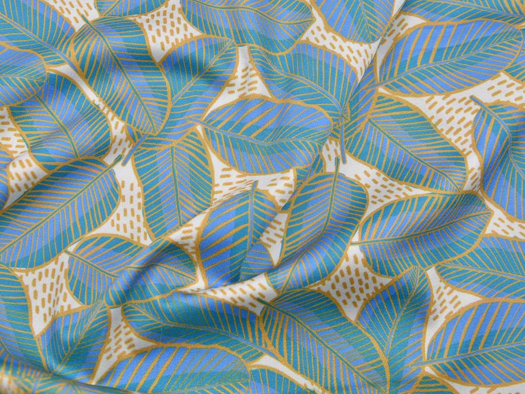 Ein wunderschöner Baumwollsatin mit Stretch in ecrue und Blättermuster in petrol und ockergelb von Editex. Dieser Stoff wurde im La Maison Viktor Magazin Ausgabe 04/2017 für das Kleid Arianne verwendet.