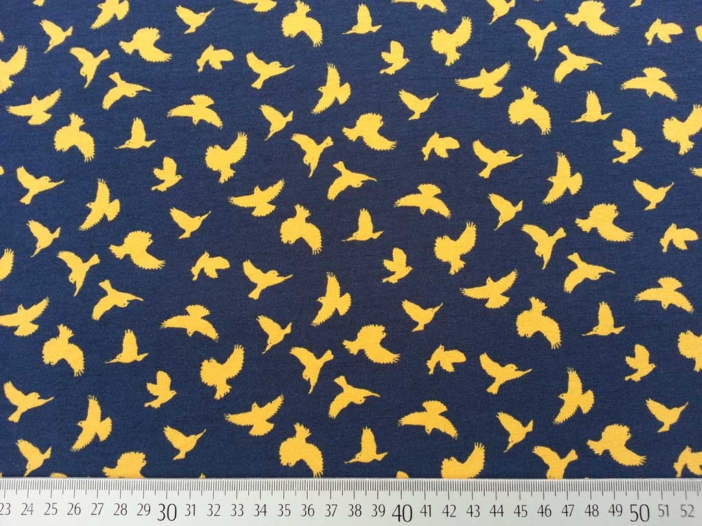 Ein weicher Baumwolljersey von Megan Blue in dunkelblau mit sonnengelben Vögeln.