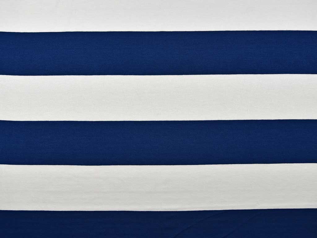 Ein weicher und locker fallender Viskosejersey mit 6 cm breiten Blockstreifen in marine blau und weiß. Aufgrund des Elasthan Anteils dehnt sich der Stoff leicht und bietet hohen Tragekomfort.
