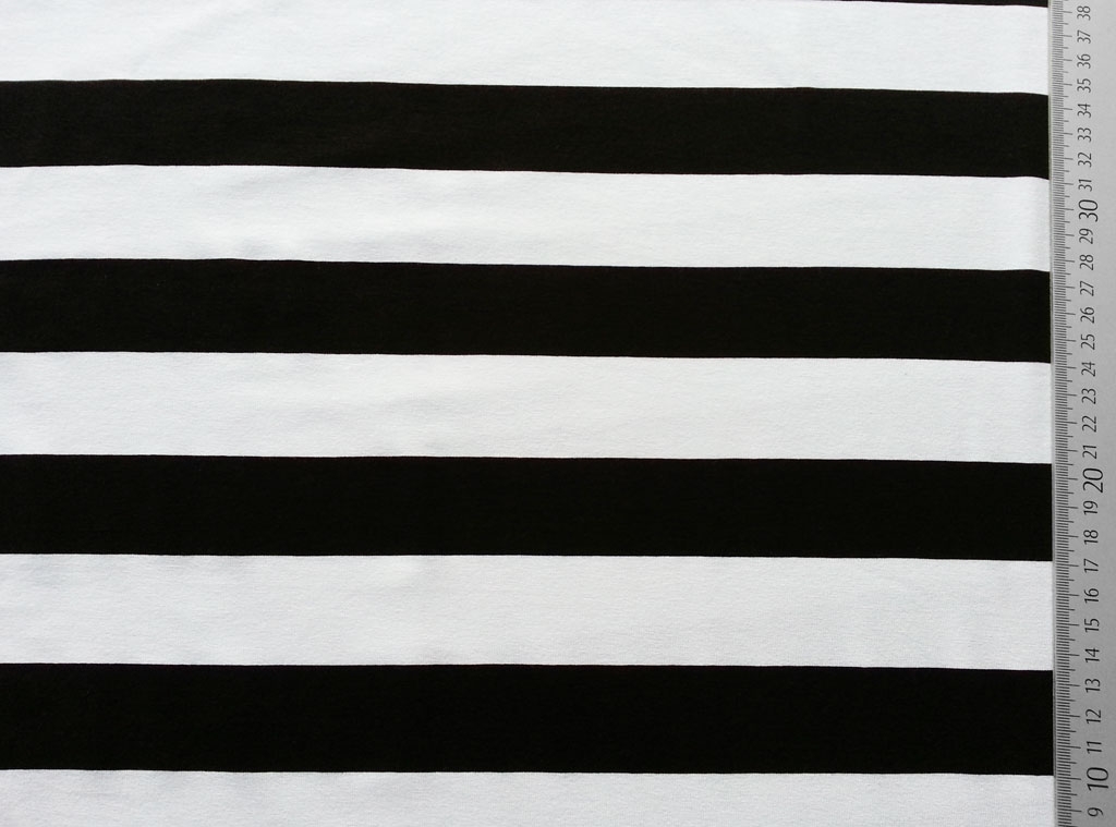 Ein weich und locker fallender Viskosejersey namens St. Tropez mit 4 cm breiten Blockstreifen in schwarz und weiss.