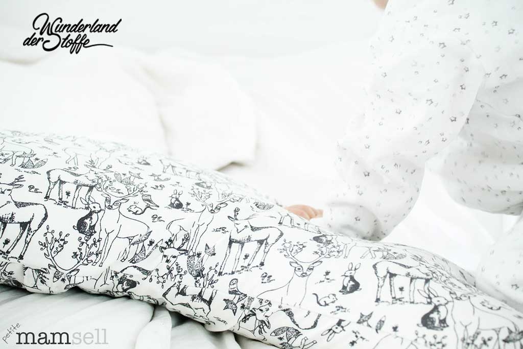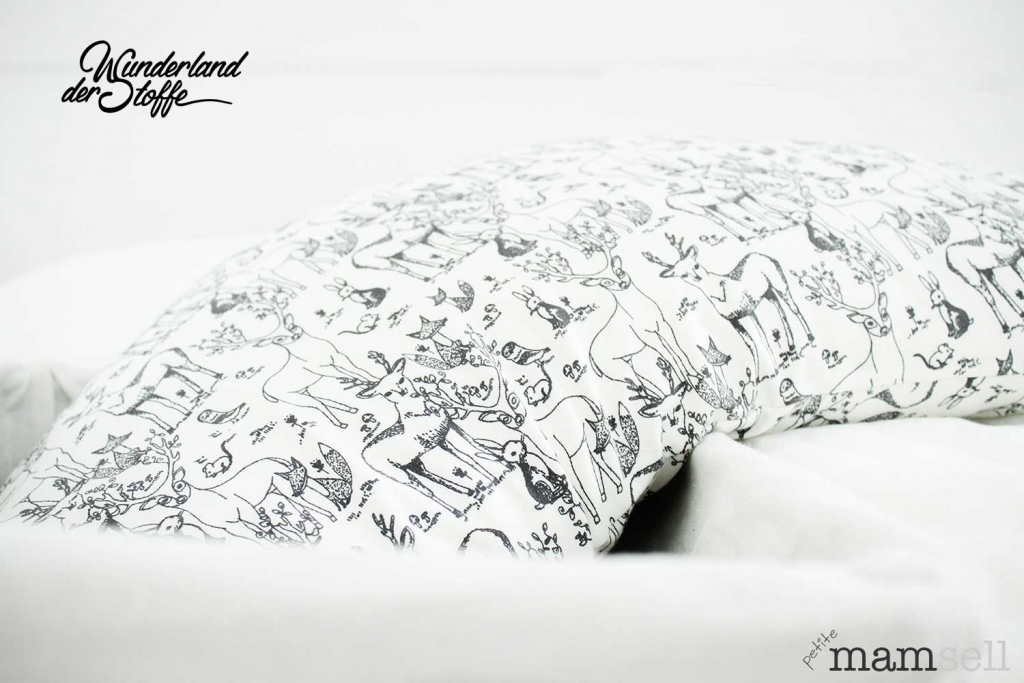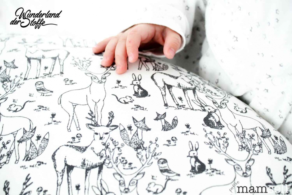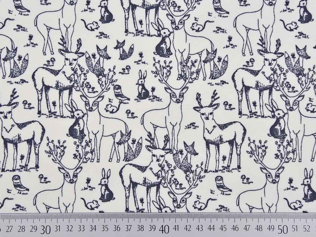 Ein wunderschöner Jersey aus Baumwolle (Bio) in grauweiss mit Hirschen, Hasen, Füchsen, Mäusen und Vögeln in grau.