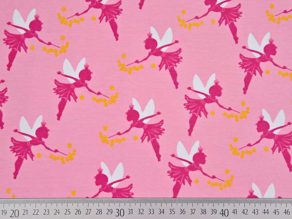 Ein weicher, rosa Baumwolljersey mit zuckersüßen, pinken Elfen mit weißen Flügeln sowie kleinen gelben Sternchen.