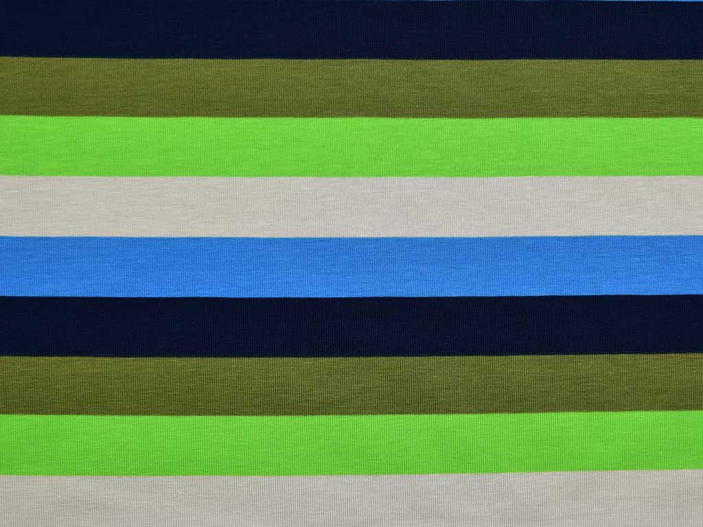 Ein wunderschöner Jersey mit 2 cm breiten Blockstreifen in hellgrün, hellgrau, mittelblau, dunkelblau und khaki.