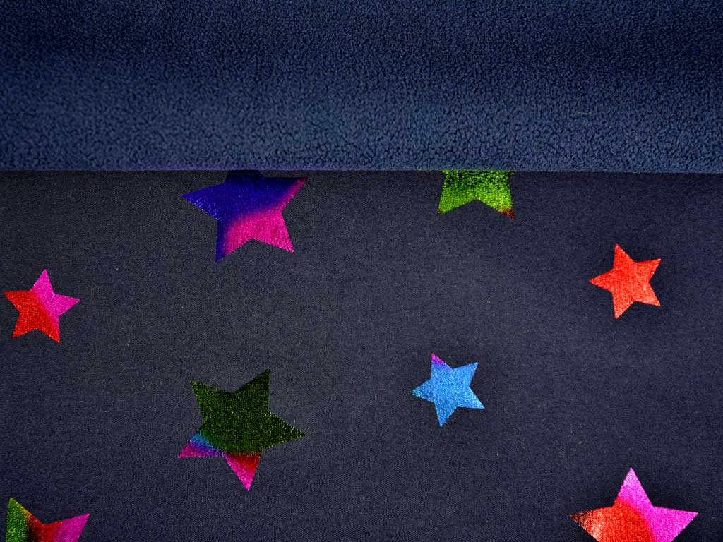 Ein super cooler Softshell Stoff in nachtblau mit mit bunten Glitzersternen in leuchtenden Regenbogenfarben. Die Rückseite besteht aus angenehm weichem Fleece in dunkelblau. Durch den Elasthan Anteil dehnt sich der Stoff leicht und bietet somit hohen Tragecomfort. Der Stoff ist wind- und wasserabweisend.