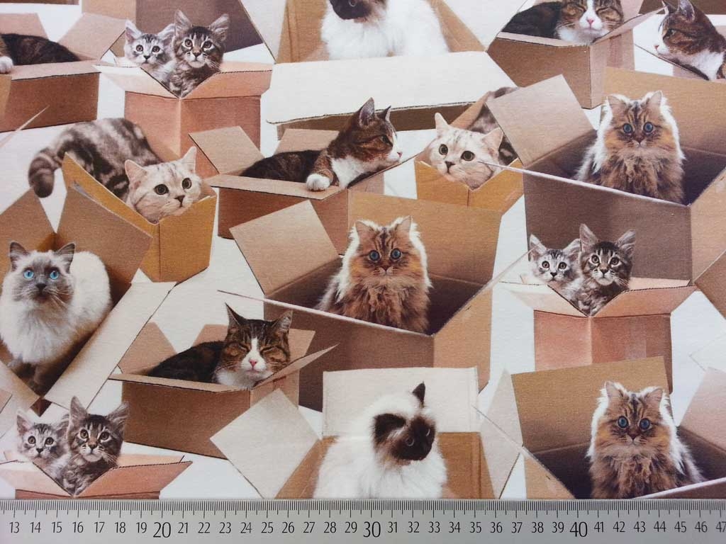 Ein weicher Jersey mit süßen Katzen, die in Kartons sitzen als Digitaldruck. Der perfekte Stoff für Katzenliebhaber!