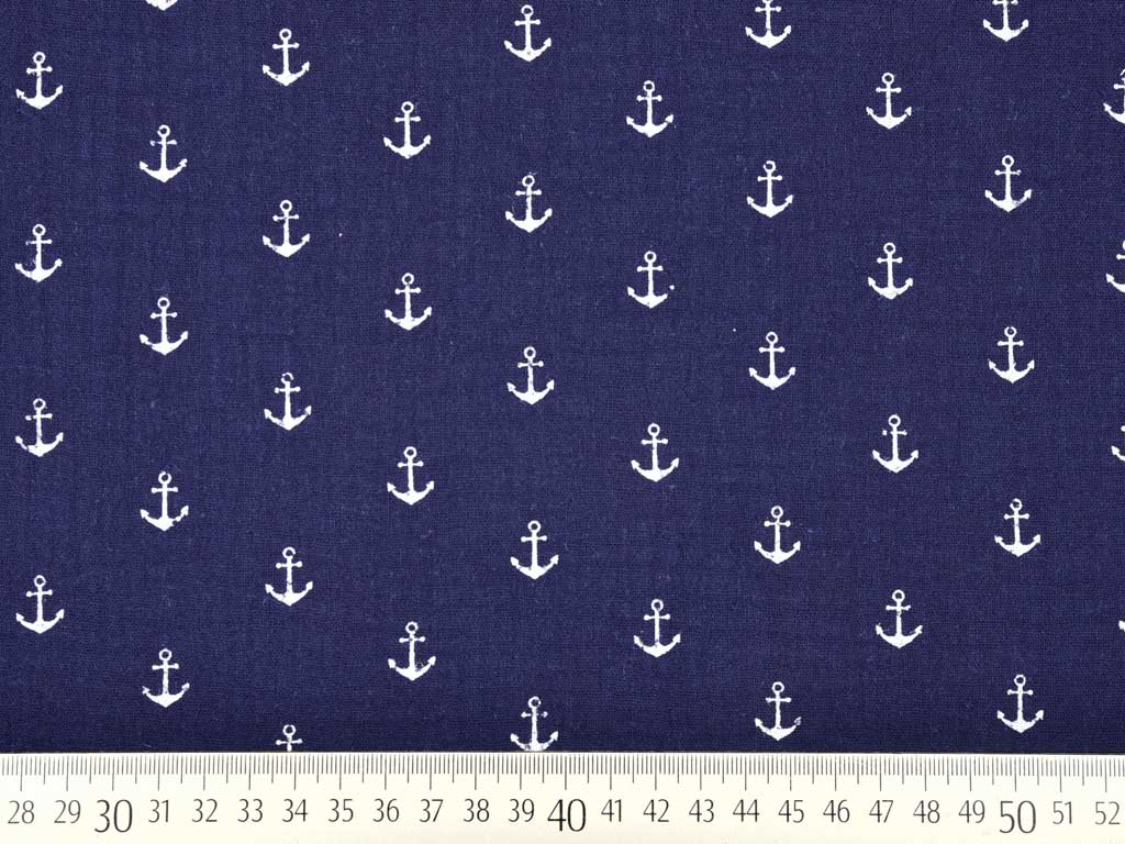 DER angesagte Stoffe der Saison: Double Gauze!! Die Modewelt hat diesen Stoff neu entdeckt und so werden nicht mehr nur Spucktücher und Windeln daraus genäht, sondern modische Fashion Teile! Hier als weicher Double Gauze in dunkelblau mit weißen Ankern.
