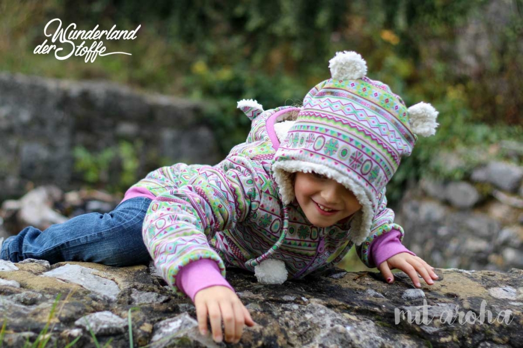 Ein weicher Jacquard Strick aus 100% Baumwolle mit wunderschönem Inkamuster in harmonischen Farben wie z.B. beere, hellgrün, weiß, rosa.