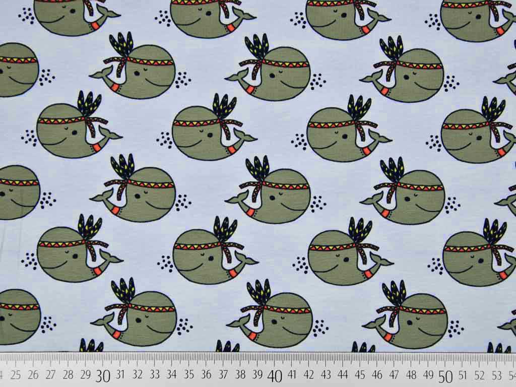 Ein weicher, hellblauer Baumwolljersey aus dem Hause Stenzo mit süßen khakifarbenen Walen mit Indianerstirnband.